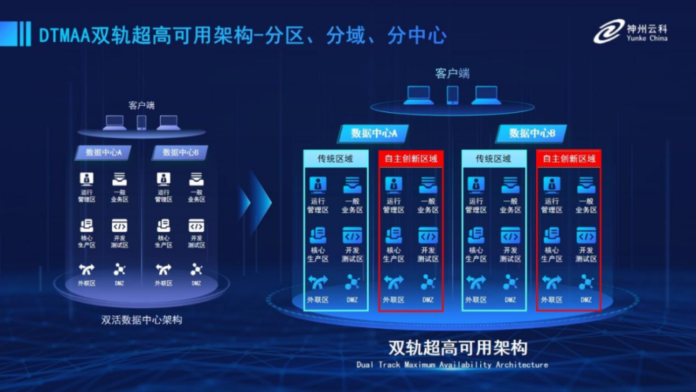 为帮助金融客户更好地应对数字经济时代对可持续性的高要求,实现“信创”与“数字化”齐头并进,BB贝博艾弗森推出了双轨超高可用架构。该架构在双活数据中心的分区调度基础上,增加信创域和非信创域的分域调度,实行信创域与传统域应用全量部署,使双中心运营变为双中心四区域并行运行,互为多活,将“0到1”的单轨建设道路变为分区分域协同的多活双轨超高可用架构。帮助客户在新架构下,保障“信创”的同时解决性能瓶颈,提升稳定性,保证应用可持续性,最终实现信创区域和非信创区域的平滑过渡,完成国产化替代目标。